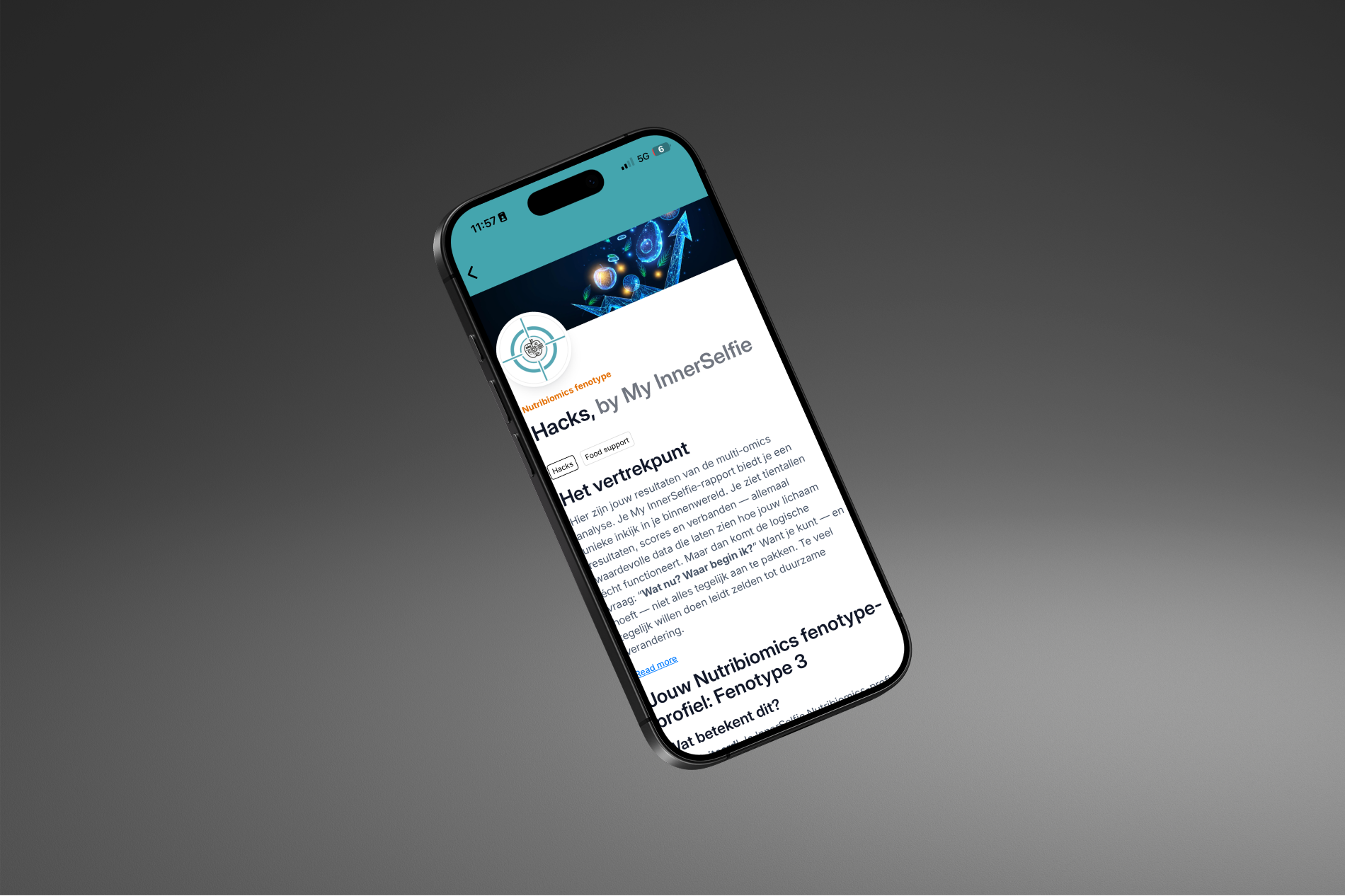 Met de My InnerSelfie app zet je de volgende stap in gepersonaliseerd welzijn en levensstijloptimalisatie. Deze innovatieve app geeft je diepgaand inzicht in zowel je fysieke als mentale gezondheid, gebaseerd op geavanceerde biologische analyses. Door middel van verschillende thuistesten – zoals speeksel-, urine-, zweet- en stoelgangsamples – verkrijg je gedetailleerde gezondheidscores die jouw unieke biologische profiel in kaart brengen. De app vertaalt deze inzichten naar heldere adviezen en concrete acties om je levensstijl te verbeteren. Daarnaast biedt My InnerSelfie een diepere blik op je fenotypes, de zichtbare en meetbare kenmerken van je lichaam die worden beïnvloed door zowel je genetica als je omgeving. Door deze kennis slim in te zetten, kun je beter begrijpen hoe je lichaam functioneert en welke aanpassingen het meeste impact hebben op jouw welzijn. Download de app hier: Android (Google Play) iOS (App Store)