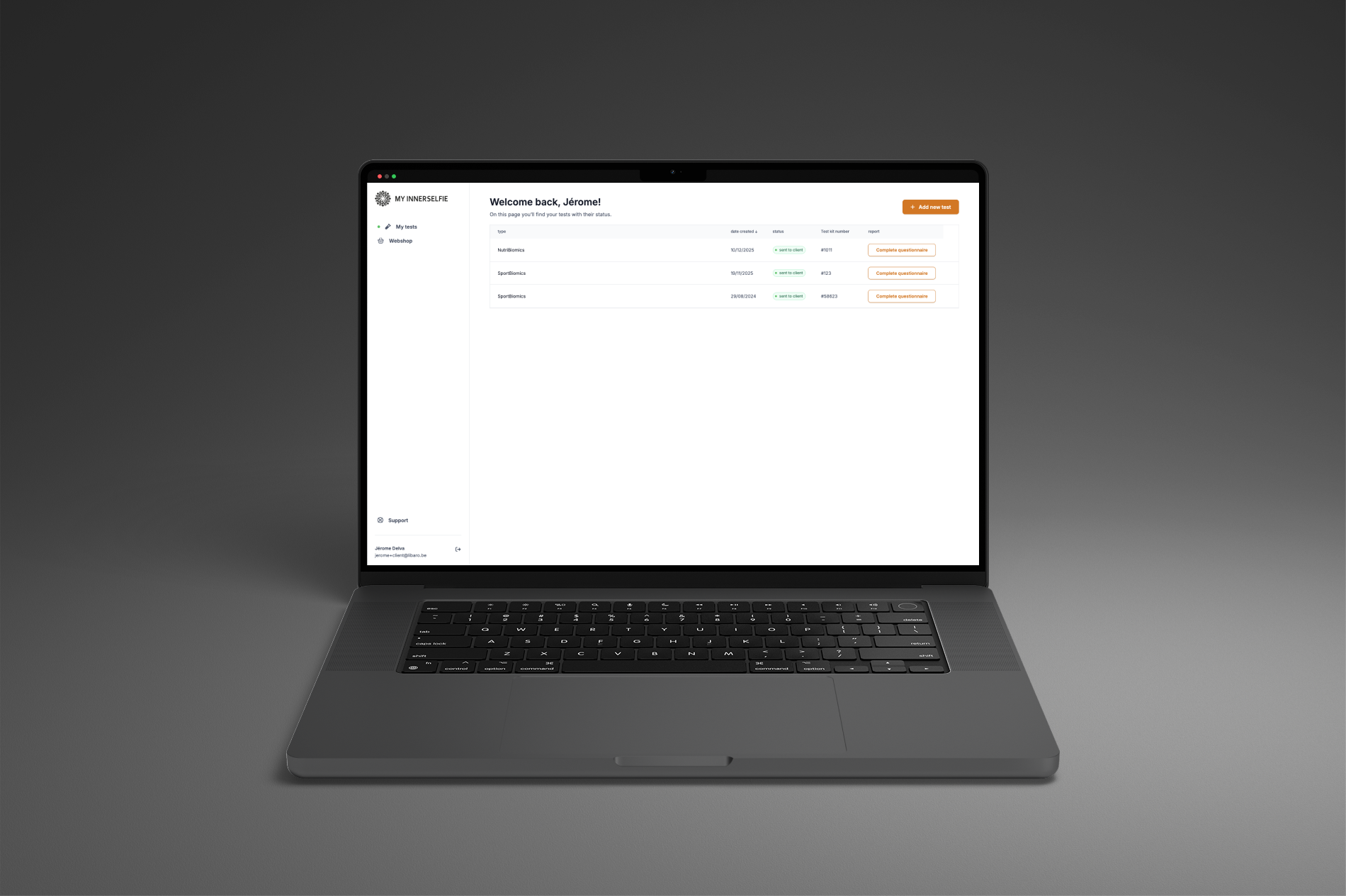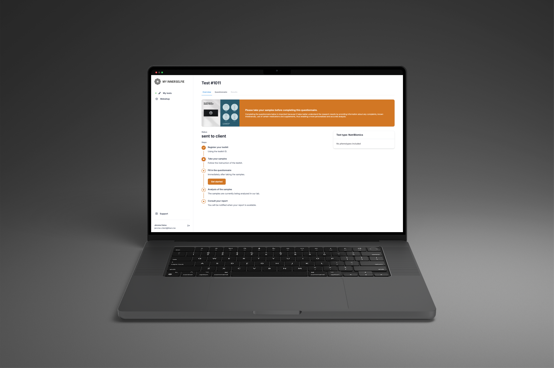 Als klant kun je testkits aankopen, nieuwe tests toevoegen en je toegevoegde tests bekijken. Tijdens het toevoegen van een test vul je een vragenlijst in en verzamel je verschillende samples, die vervolgens worden opgestuurd. Na de analyse van je samples ontvang je een rapport dat je eenvoudig kunt openen en bekijken binnen het platform. Deze rapporten geven inzicht in cruciale gezondheidsgebieden zoals je nutritionele behoeften, microbioom en metabolieten.